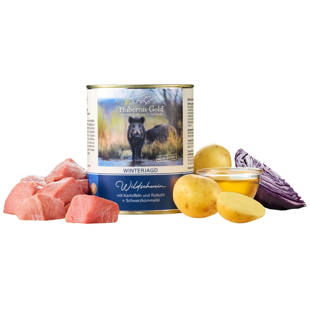 Das schmackhafte Menü zur Winterjagd bietet Ihrem Jagdhund mit seiner Zusammensetzung eine ausgewogene Ernährung: Aromatisches Fleisch vom Wildschwein wird kombiniert mit leckerer Kartoffel und gesundem Rotkohl. Zusätzlich versorgt das Schwarzkümmelöl Ihren Hund mit vielen wichtigen und gesättigten Fettsäuren. Alleinfuttermittel